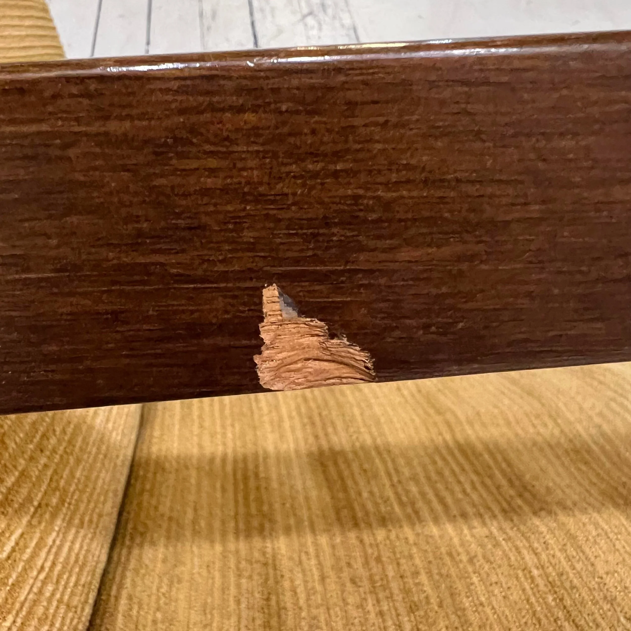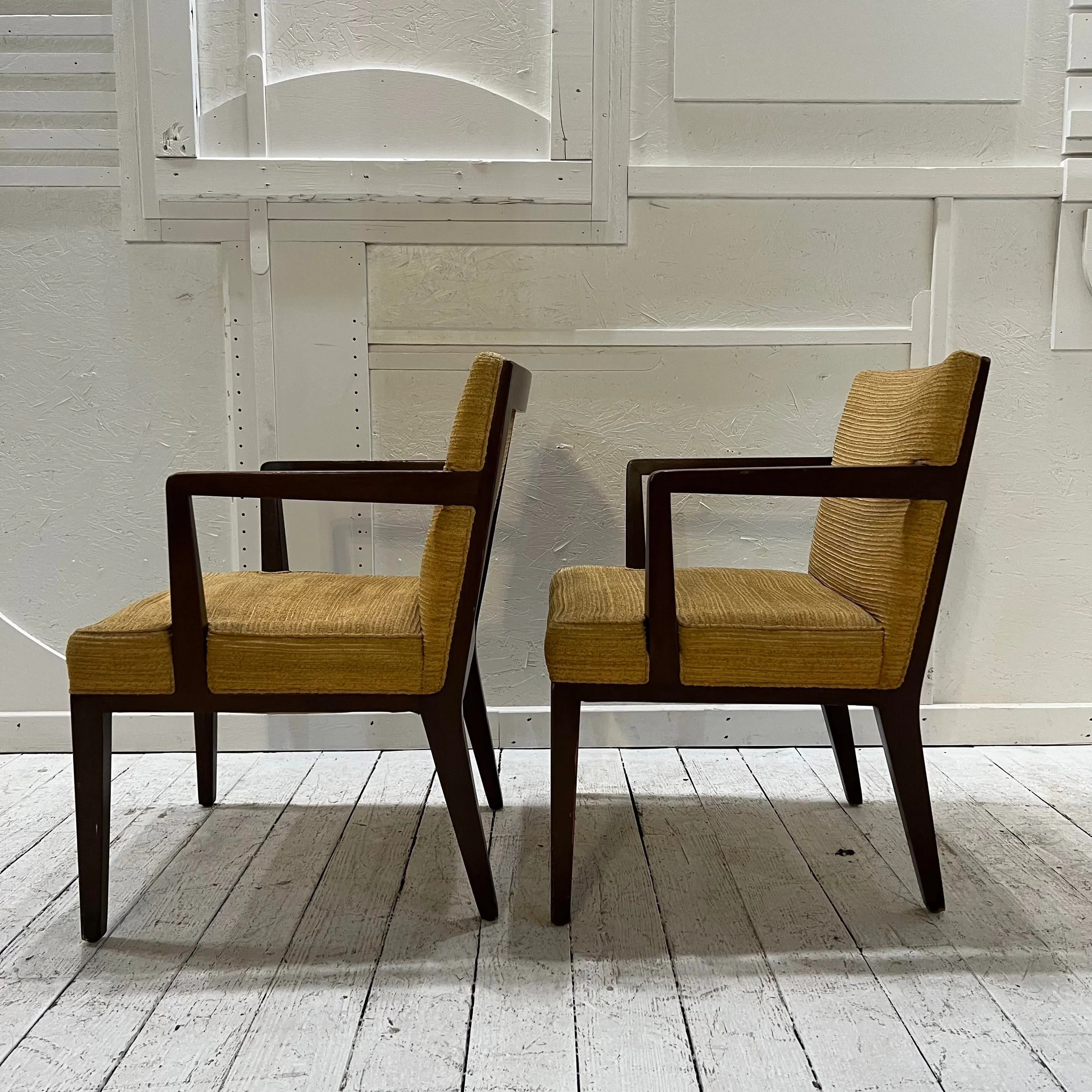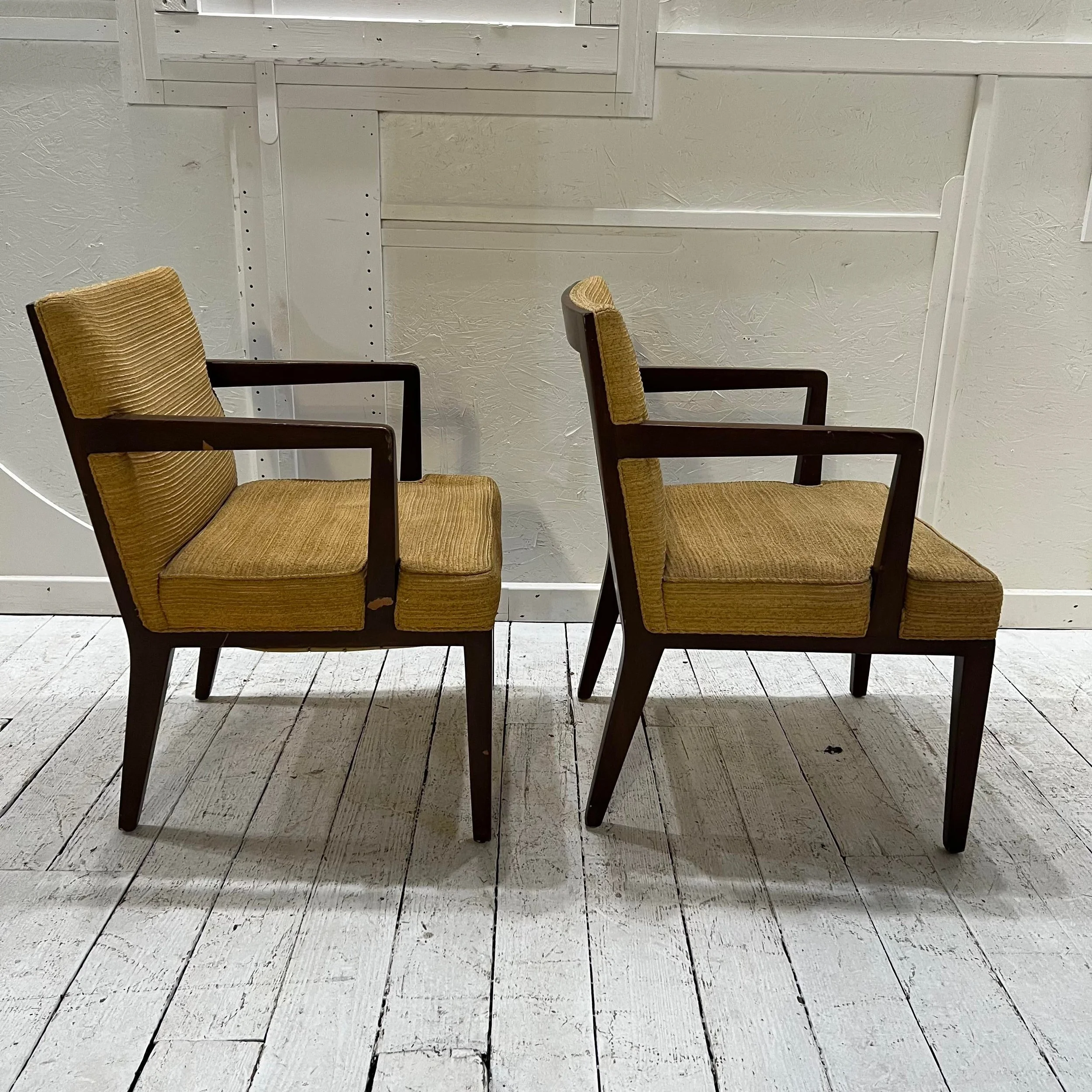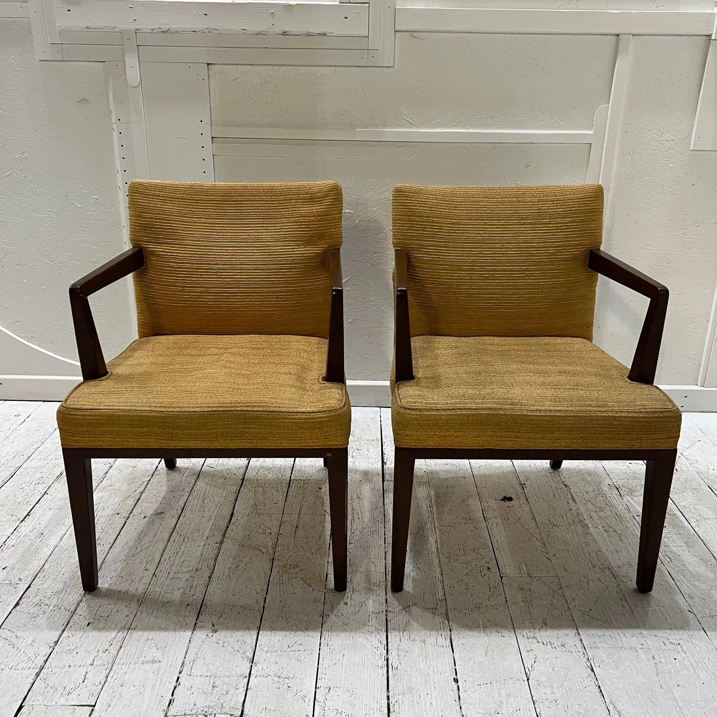 Description: Elegant pair of vintage armchairs designed by Ward Bennett for Brickel Associates. Crafted in solid oak with a rich stained finish, these chairs showcase Bennett’s signature clean lines, refined proportions, and timeless modernist aesthetic. The design features gently curved arms, sturdy joinery, and a warm wood tone that complements a variety of interiors. Perfect as accent seating, dining chairs, or placed in an office or study. This pair offers both comfort and classic design pedigree.